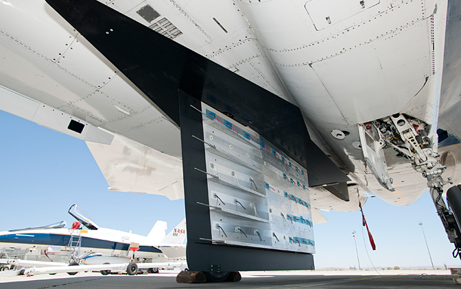 In order to test what might be possible, NASA’s Dryden Flight Research Center is conducting Supersonic Boundary Layer Transition (SBLT) tests in partnership with Aerion Corporation. Here’s the instrument pylon underneath a Dryden F-15B: